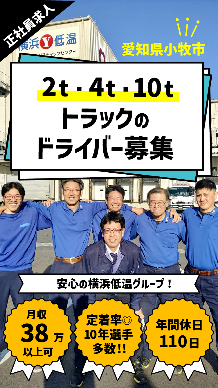 | 仕事内容 | 2t・4t・10tトラックいずれかのルートドライバーです。 東海エリアの量販店、生協の配送センターを中心に、 冷凍食品やチルド食品を運びます。 商品は1箱1kg~10kgほど。 車輪のついたカゴ車なども使用するので、 力仕事に不安がある方もご安心ください。 ◎ルート配送で、1日5件~10件ほど回ります。 ◎どのトラックを運転するかは選んで頂けます。 ◎2t車からスタートし、免許取得支援制度を利用して 中型ドライバーや大型ドライバーへのステップアップも可能です。 |